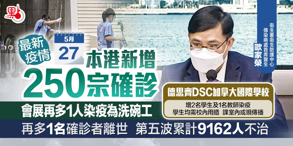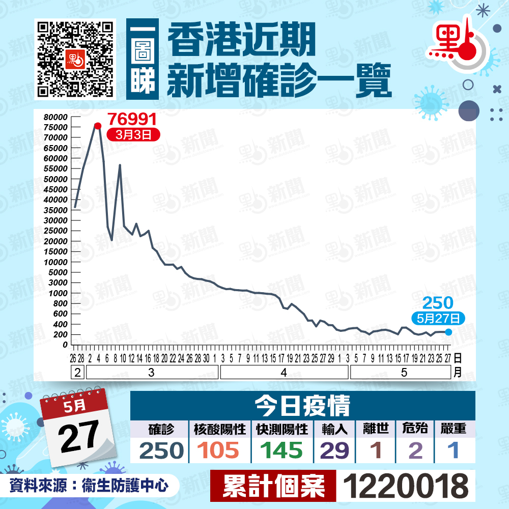 本港第五波疫情緩和,衞生署及醫管局今日(27日)下午舉行疫情記者會。衞生署衞生防護中心傳染病處首席醫生歐家榮公布,截至今日零時,本港新增250宗確診個案,當中105宗為核酸檢測陽性,145宗為快測陽性個案。新增個案中,包括29宗輸入個案。本港第五波疫情累計1198957宗個案。