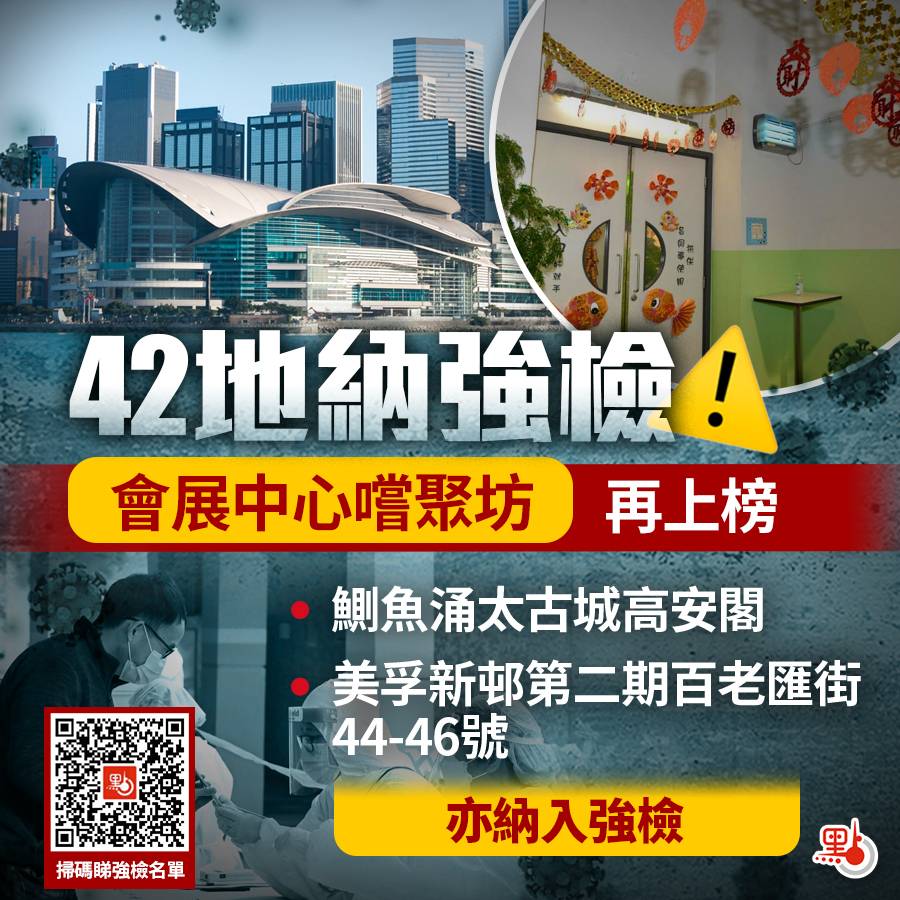 須強檢的地點當中,灣仔會展中心嚐聚坊(員工飯堂)連續兩日上榜,兩名確診患者均曾於5月20日至23日上午7時30分之間前往該處的職員餐廳,而當中一名患者居住地西營盤荔安大廈亦因而被納入強檢公告。