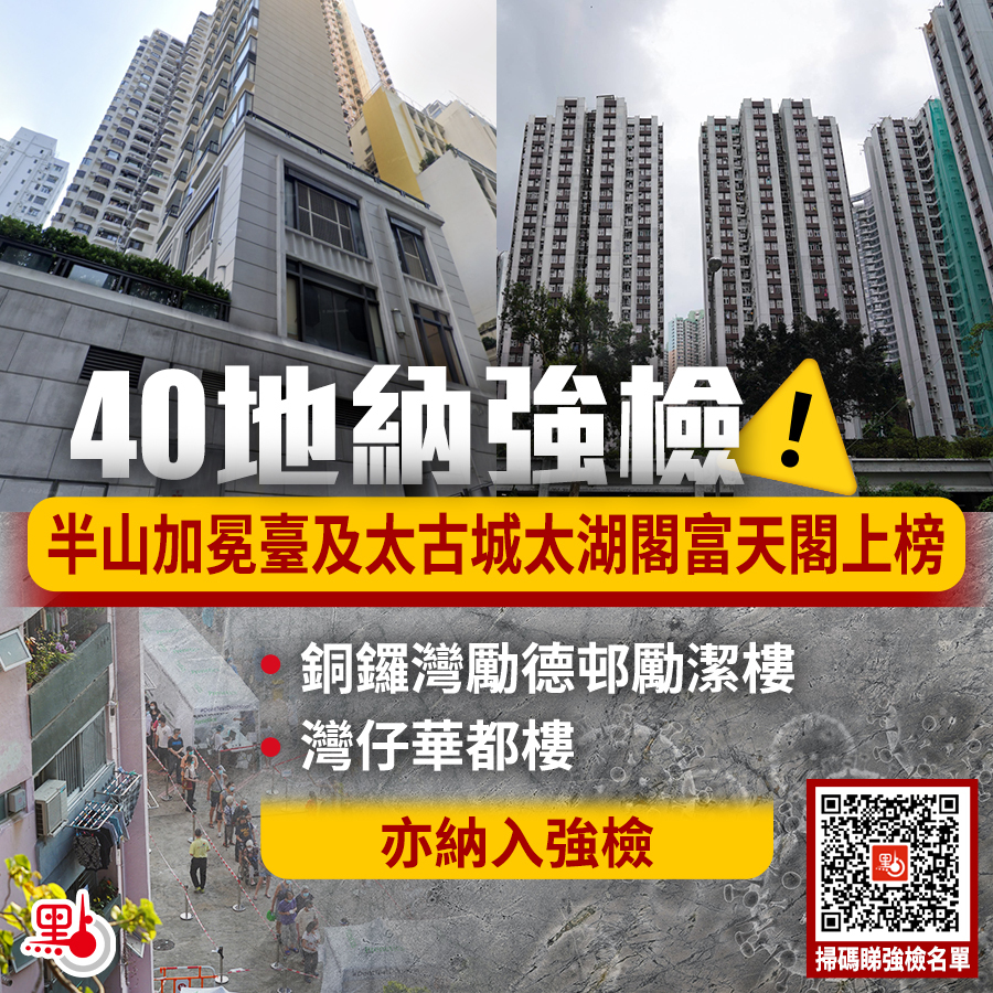 本港第五波疫情緩和,今日(29日)新增237宗確診個案。因應多宗陽性檢測個案,今日再有40個指明地方被納入強制檢測公告,有關市民均須於5月30日至31日內完成檢測。強檢名單中,包括半山區加冕臺1號No.1加冕臺,鰂魚涌太古城太湖閣及太古城富天閣,銅鑼灣勵德邨勵潔樓以及灣仔活道42號華都樓等。
