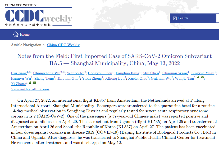 根據中疾控披露,BA.5序列於2022年3月15日首次上傳至全球流感共享數據庫,該序列來自於2月25日在南非採集的一名患者的鼻咽拭子。輸入上海病例情況於4月25日從烏干達(KL535航班)出發,4月26日在阿姆斯特丹轉機,4月27日從韓國首爾轉機(KL535航班)。該患者已在中國和烏干達分別接種了四劑抗新冠肺炎疫苗(北京生物製品研究所有限公司)。確診後,他被轉送至上海市公共衞生臨床中心接受治療。經治療痊癒,5月12日出院。病毒基因測序結果顯示,該患者感染了新冠病毒奧密克戎亞型變異毒株BA.5,是內地報告的首例BA.5境外輸入感染者。