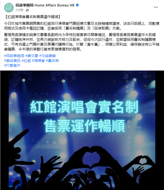 民政事務局社交網頁表示,今早署理局長陳積志與康文署署長劉明光特別留意首日開售情況。見到售票運作大致暢順、訂購秩序井然,署理局長表示高興並感謝各方努力及配合促成今次試行運作。陳積志指期望採用實名制購票模式可有效遏止門票炒賣及高價代購等行為,打擊「黃牛黨」、保障公眾利益,確保樂迷有公平機會購票,令本港的演藝行業可以更加健康蓬勃的發展。