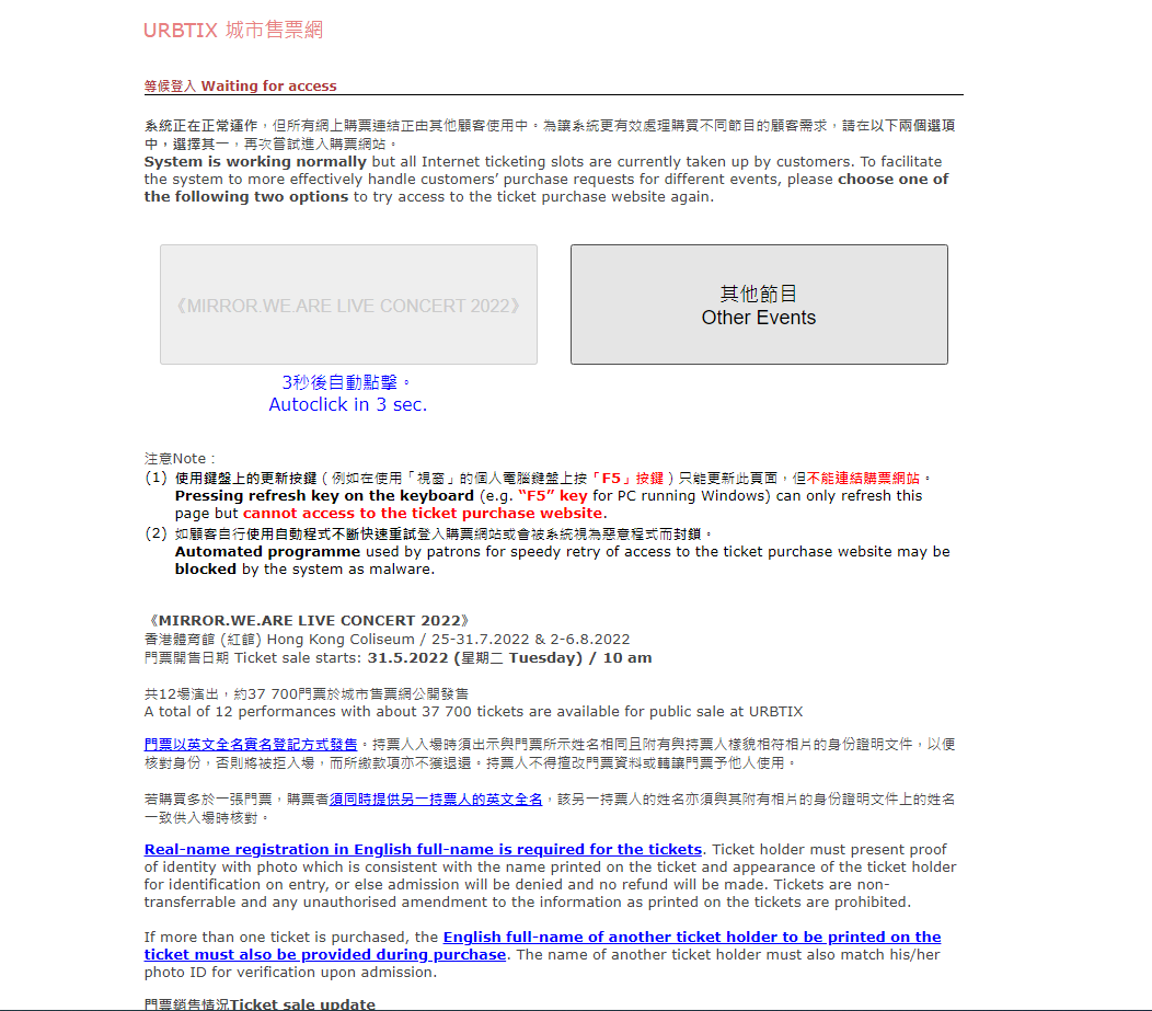 人氣男團MIRROR經城市售票網公開發售的12場演唱會門票今早(31日)10點以實名制形式發售,開售後兩小時內售出約13%,即4600張門票。