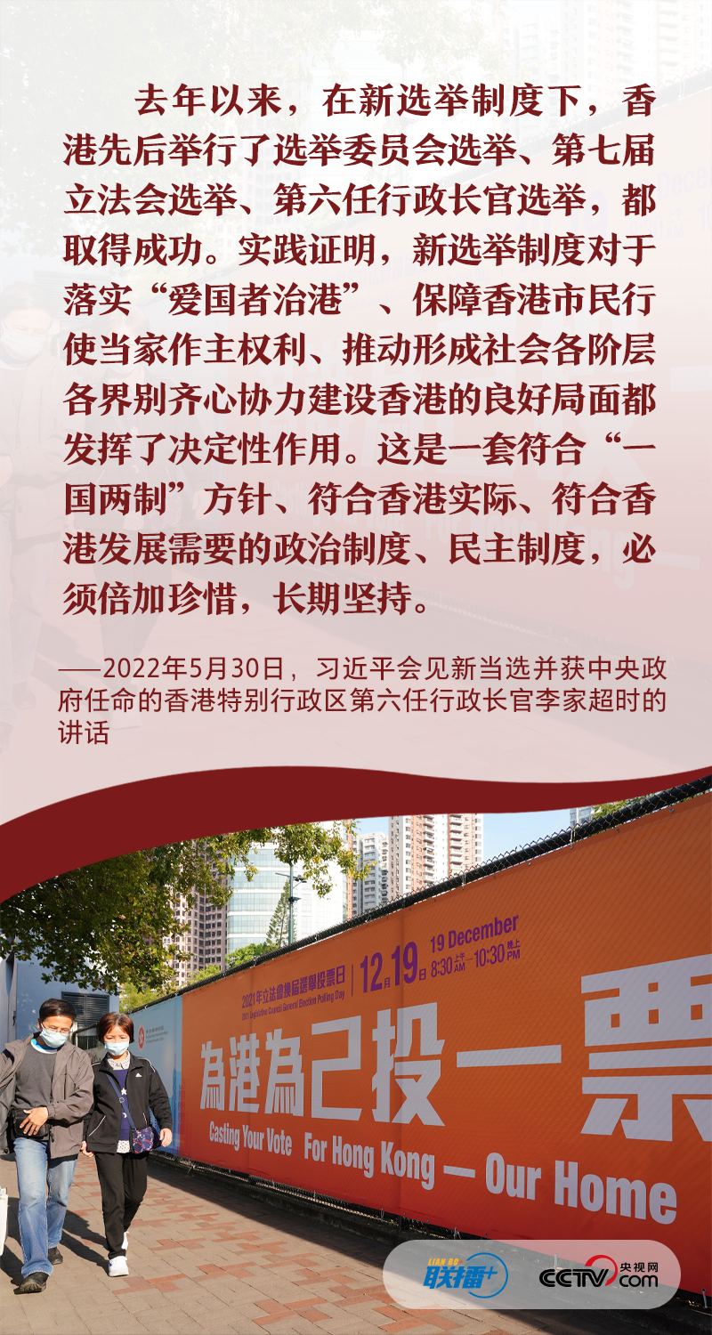 「實踐證明,新選舉制度對於落實『愛國者治港』、保障香港市民行使當家作主權利、推動形成社會各階層各界別齊心協力建設香港的良好局面都發揮了決定性作用。」