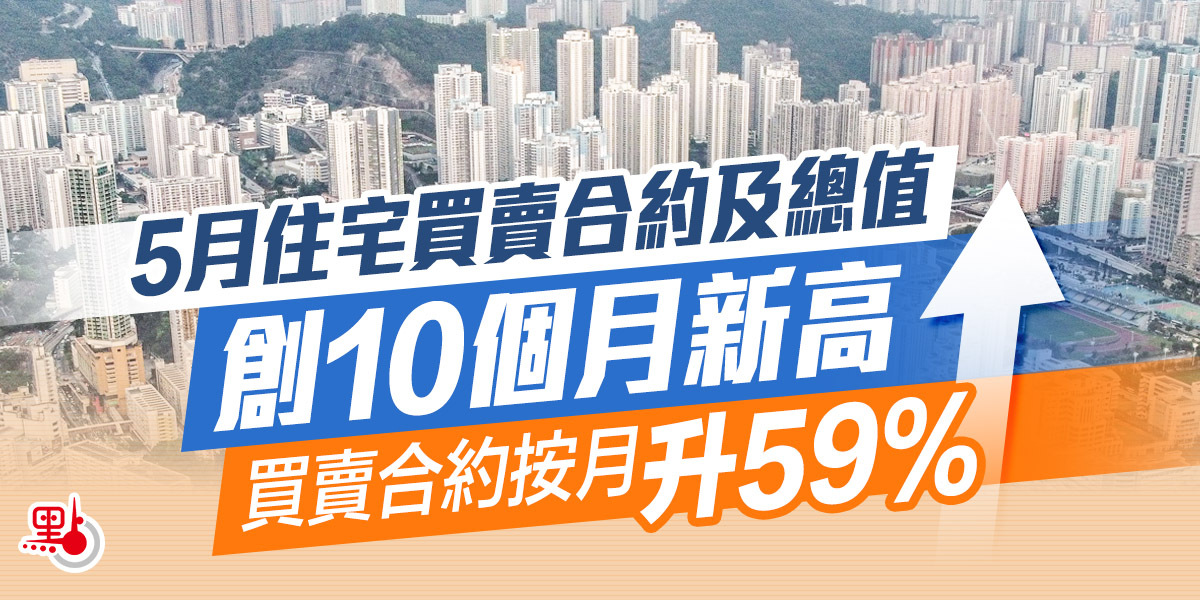 土地註冊處今日(2日)發布統計數字,5月住宅樓宇買賣合約數及合約總值均創10個月新高。上月整體物業註冊量為7949宗,按月升63.8%,連升兩個月;5月住宅樓宇買賣合約6202份,按月上升59.1%,按年則下跌12.5%;合約總值770億元,按月上升84.3%,按年下跌12.1%。