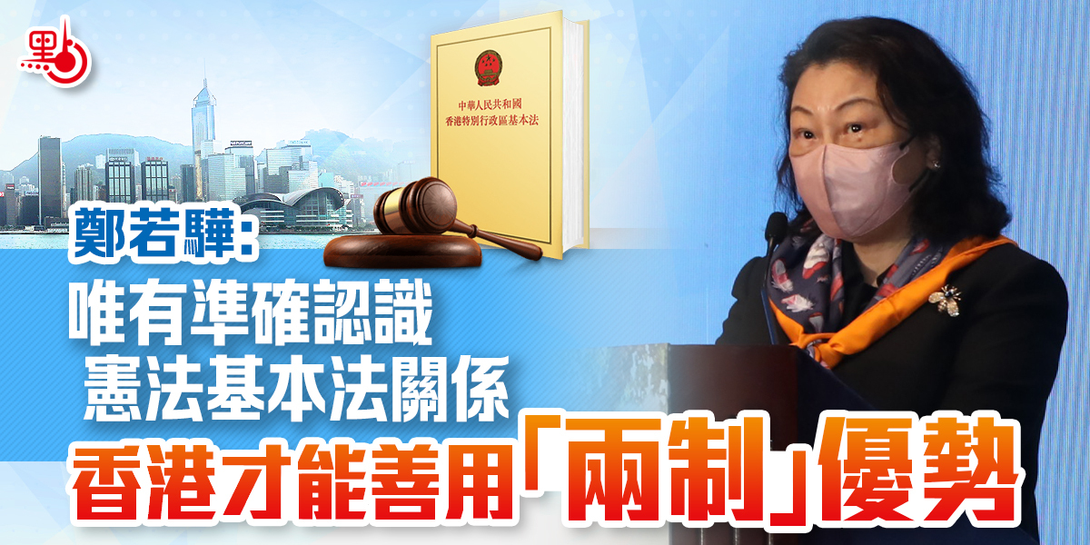 鄭若驊回顧剛剛結束的兩場法律論壇,她在基本法法律論壇上與基本法委員會副主任譚惠珠分享「一國兩制」及基本法的根本概念,解釋了全國人大常委會按基本法第158條規定擁有基本法的解釋權,是完全符合香港特區的憲制地位,更與全國人大常委會按憲法解釋法律的權力及全國人大按憲法監督憲法的實施的權力一致,體現了中國人民代表大會制的政治制度下全國人大是最高國家權力機關。