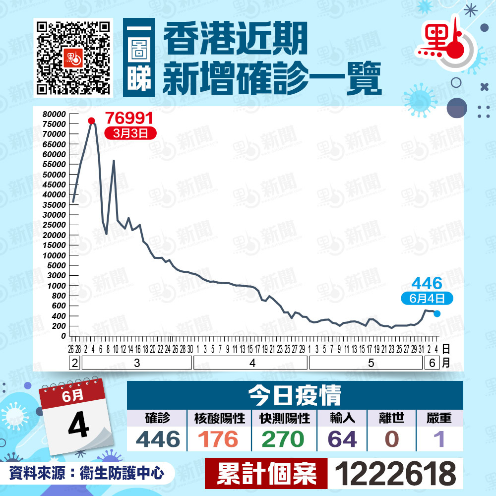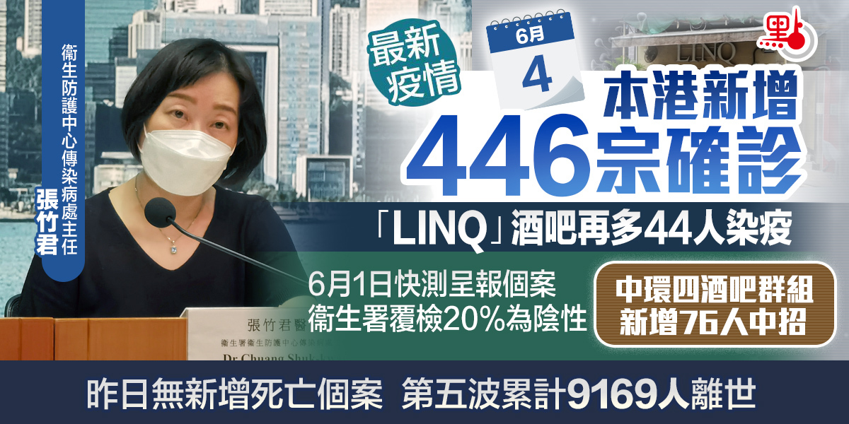 本港第五波疫情有反彈跡象,衞生署及醫管局今日(4日)下午舉行疫情記者會。衞生署衞生防護中心傳染病處主任張竹君公布,截至今日零時,本港新增446宗確診個案,當中176宗為核酸檢測確診,270宗為快測陽性個案。新增個案中,包括64宗輸入個案。本港第五波疫情累計1202007宗個案。