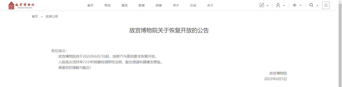 故宮博物院今日(5日)在其官網發布公告稱,故宮博物院將於6月7日起,按照75%限流要求恢復開放。入院觀眾須持有72小時核酸檢測陰性證明,配合測溫和健康寶查驗。根據北京市疫情防控形勢,故宮博物院早前於5月12日暫時閉館。