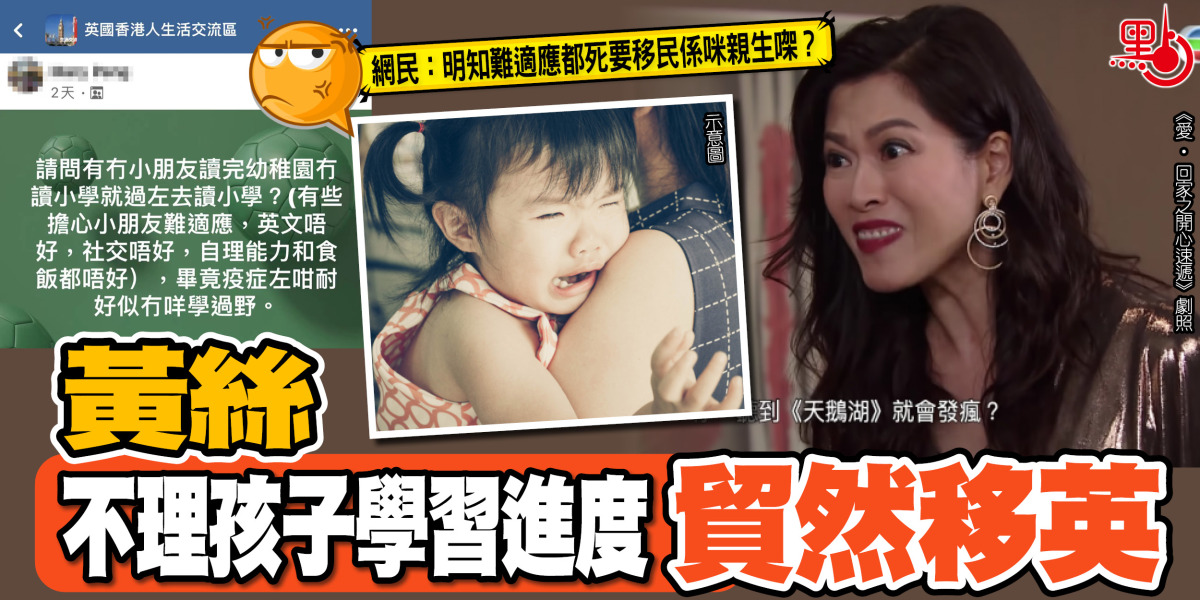 該名港媽在fb專頁「英國香港人生活交流區」投稿,問「有冇小朋友讀完幼稚園,冇讀小學,就過咗去讀小學?」,形容「小朋友英文唔好、社交唔好、自理能力和食飯都唔好」,直指因疫情冇咩學過嘢,話擔心小朋友難以適應喎。事實上,早前已有不少報道指,移民造成子女心靈創傷,受語言不通、文化差異、同學欺凌,引發出情緒問題。