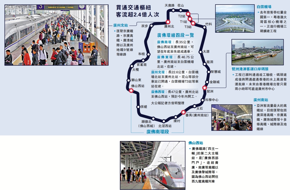 「廣佛環線串聯起廣州南站、白雲機場、廣州北站及佛山西站等重大樞紐,全線二十多座車站目前也已全部敲定,這些車站也都接駁一系列高鐵、城際及地鐵線路,形成『環線』與『放射線』實現互聯互通。」廣東省交通運輸廳有關負責人表示,廣佛環線作為灣區城際鐵路網中的重要環線,與廣珠、廣清、廣佛肇、廣佛江珠、佛莞惠、穗莞深等多條放射性城際線銜接,通過環線換乘,可實現與大灣區主要城市的快速通達。「『環線+放射線』促使灣區城際鐵路網的運行效能最大化,提升灣區『廣佛極點』的對外輻射能力」。