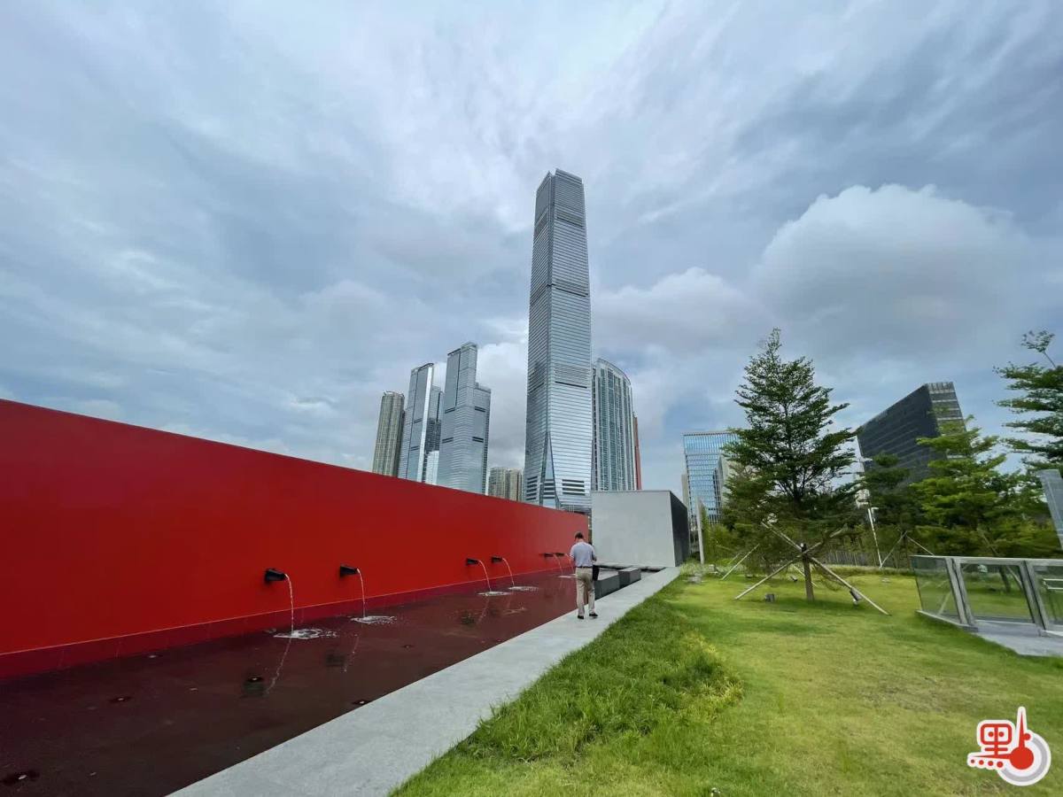 香港故宮文化博物館外的紅牆流水,與香港最高樓環球貿易廣場(ICC)交相輝映。(點新聞記者李斯哲攝)