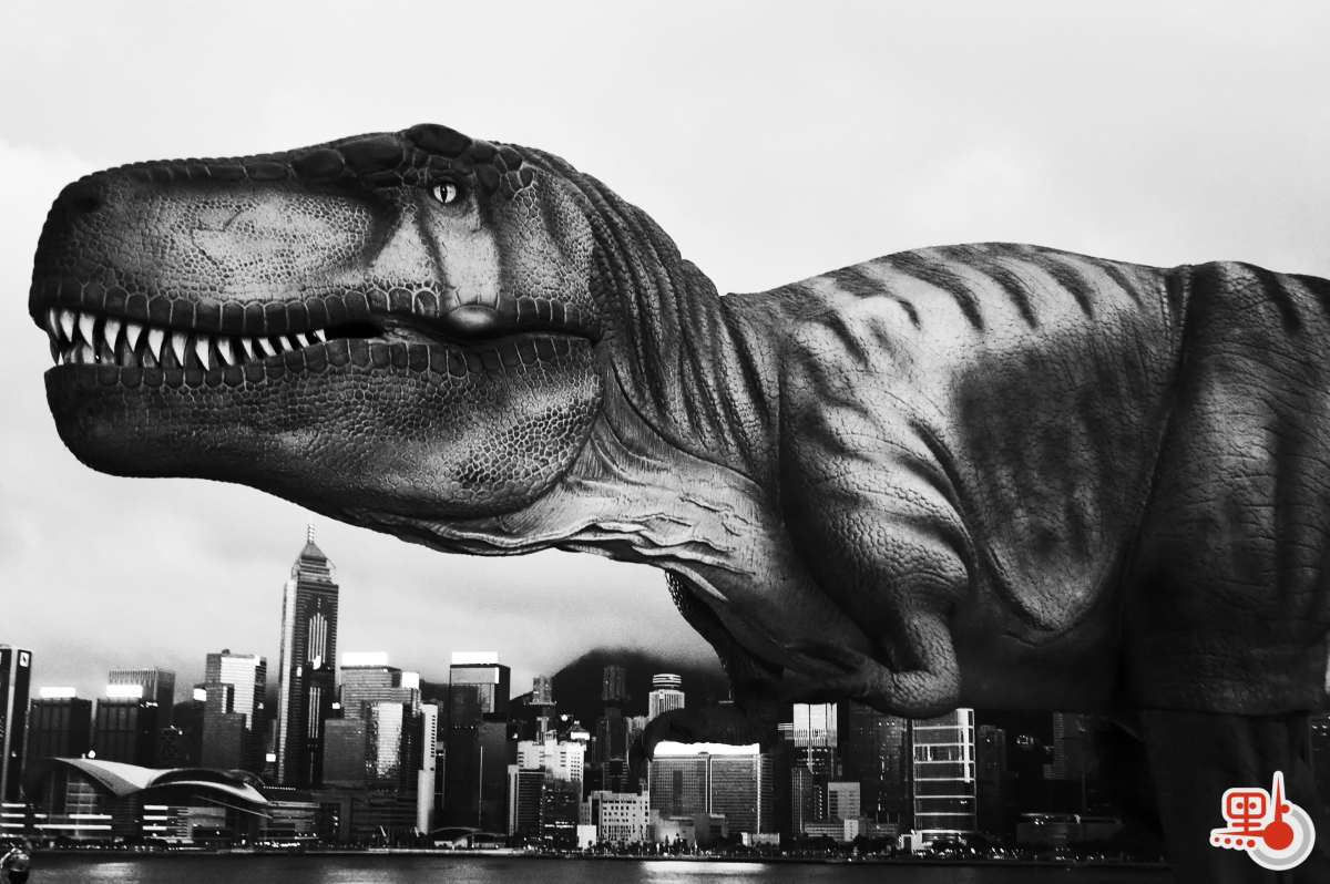 約4.6米高、12米長的機動君王暴龍於海港城「海運觀點」展出。(點新聞記者麥鈞傑攝)