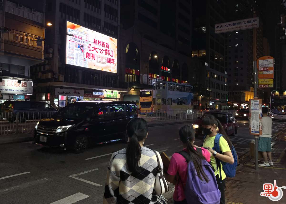 軒尼詩道國華大廈大屏上顯示「熱烈祝賀《大公報》創刊120周年」。(點新聞記者劉陽攝)