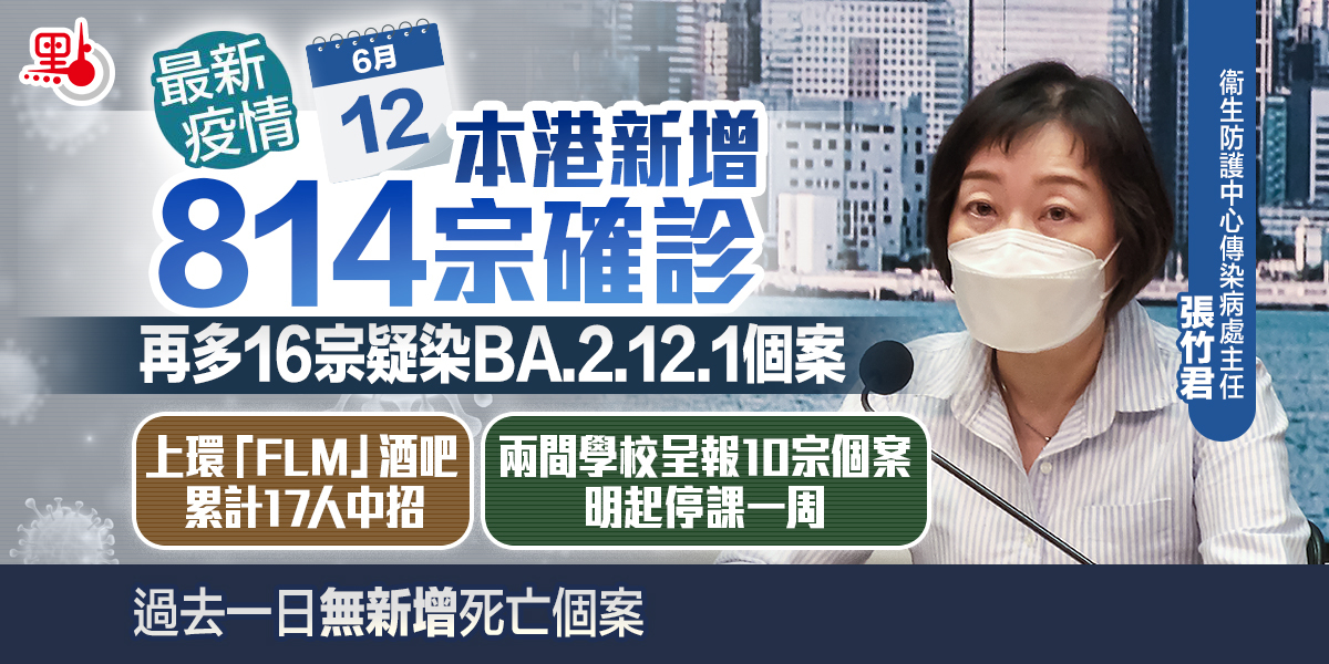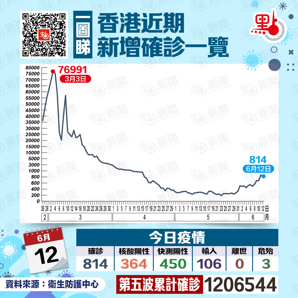 本港第五波疫情有反彈跡象,衞生署及醫管局今日(12日)下午舉行疫情記者會。衞生防護中心傳染病處主任張竹君公布,截至今日零時,本港新增814宗確診個案,當中364宗為核酸檢測確診,450宗為快測陽性且覆核陽性個案。新增個案中,包括106宗輸入個案。本港第五波疫情累計1206544宗個案。