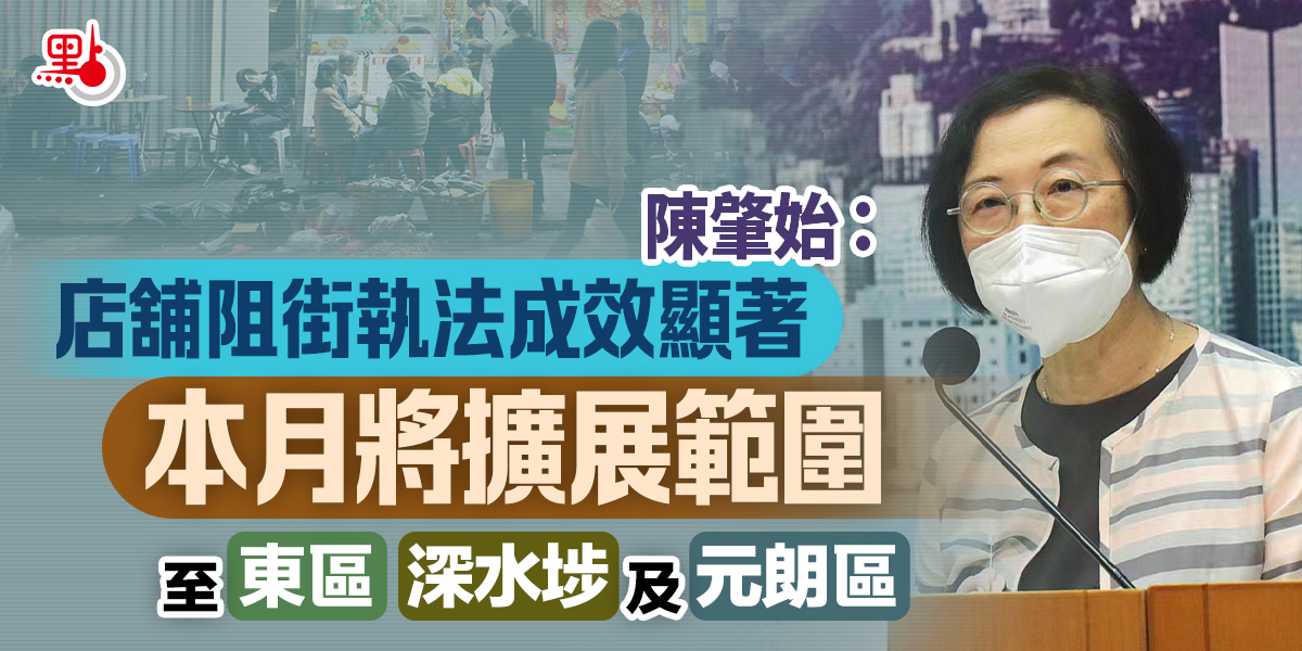 陳肇始表示,該試驗計劃實行後,本港各區環境衞生改善效果顯著。今年首4個月內,食環署在3個試驗地區共接獲約690宗有關店舖阻街的投訴,較去年同期的990宗減少300宗。她指,本月會將試驗計劃擴展至東區、深水埗及元朗區。