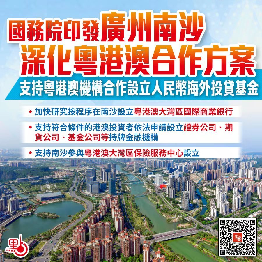 (十六)有序推進金融市場互聯互通。支持符合條件的港澳投資者依法申請設立證券公司、期貨公司、基金公司等持牌金融機構。積極支持南沙參與粵港澳大灣區保險服務中心設立。支持南沙在跨境機動車保險、跨境商業醫療保險等方面先行先試,促進粵港澳三地保險市場融合發展。支持開展移動支付創新應用。加快研究按程序在南沙設立粵港澳大灣區國際商業銀行。支持推進外匯管理改革,探索開展合格境內有限合伙人(QDLP)境外投資等政策試點,支持粵港澳三地機構合作設立人民幣海外投貸基金。加強金融監管合作,提升風險監測、預警、處置能力。