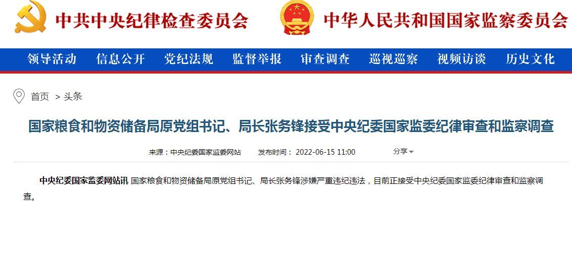 據中央紀委國家監委官網今日(15日)消息,國家糧食和物資儲備局原黨組書記、局長張務鋒涉嫌嚴重違紀違法,目前正接受中央紀委國家監委紀律審查和監察調查。