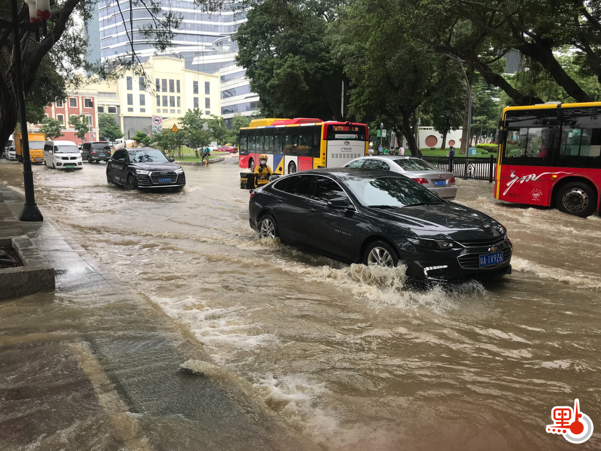 15日上午10時,記者在廣州沿江中路看到,珠江面有大量從上游飄下來的浮萍等漂浮物,從兩岸側欄處可以肉眼看到水位上漲。至上午11時30分左右,短短一個多小時,珠江水位已上漲1米多。在廣州海珠大橋底,洪水突破地面水泥磚,湧入沿江路。部分地基比較脆弱的路面,洪水湧起半米高,猶如洩洪。不到半小時,沿江中路多處路段水浸深度已經超過30厘米。有不少車輛涉水而過,洪水已經浸沒車輪一半。