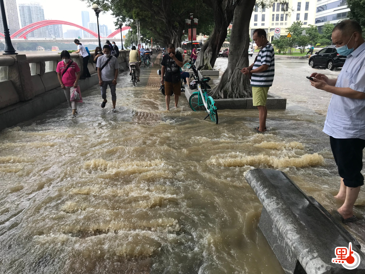 廣東省水文局今日(15日)發布消息,受潮位上漲影響,廣州珠江兩岸出現大面積潮湧現象,道路嚴重積水,交通部門採取了臨時交通管制措施,珠江水上巴士亦提前停運。