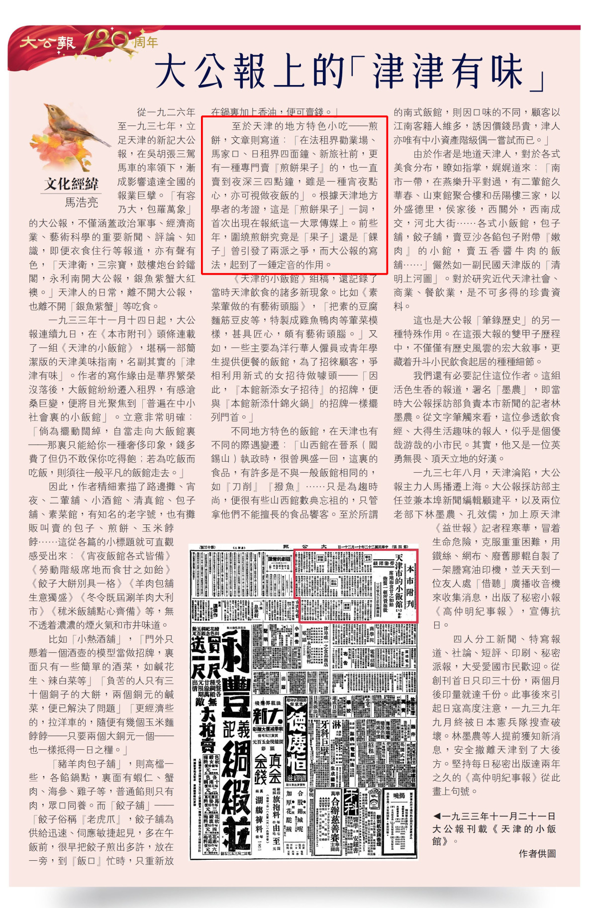 而當下新一代的大公報人,深深扎根香港這片土地,將當年從革命時期帶來的風骨和理念,融合香港特色發展,薪火相傳。《大公報》早年間那篇《天津的小飯館》就從這個代表鬥升市井的小吃上窺得歷史滄桑巨變;如今,新一代大公報人重溫當年舌尖上的滋味,感受報紙也如小小美食一般,結合傳統與創新,糅合本土與國際視野,嚴肅與活潑共存,為讀者帶來「饕餮盛宴」及「尋常滋味」。