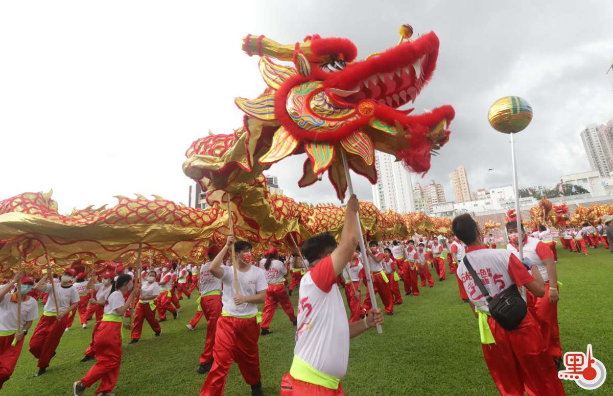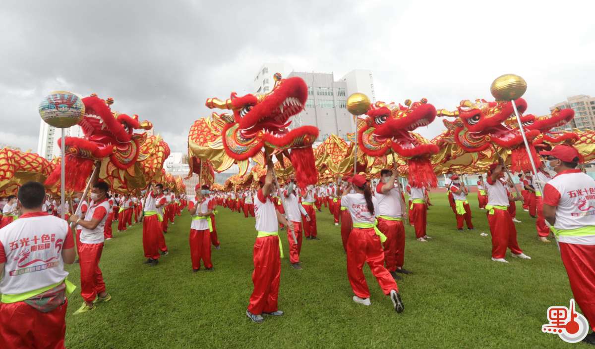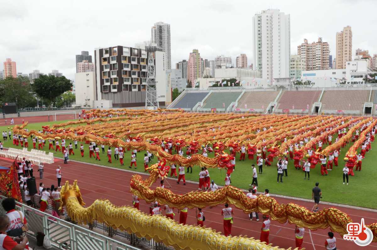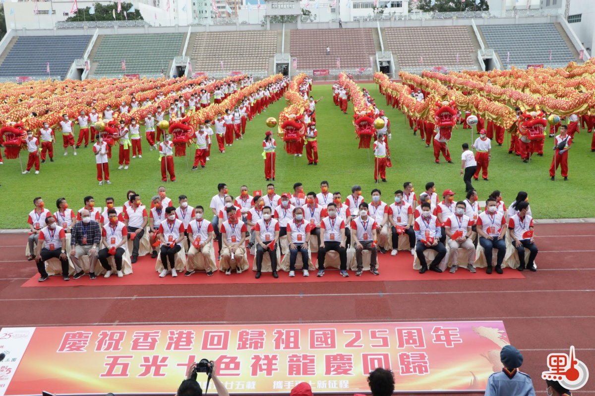 新界社團聯會和青晉義工團今日(18日)下午在元朗大球場舉行盛大的慶祝香港回歸祖國25周年「五光十色 祥龍慶回歸」活動啟動禮。近100個團體的2500名青年參加祥龍獻瑞匯演,舞動25條50米的大金龍,擺出「25」字樣和「祥龍盤旋」等造型,呈現「龍飛鳳舞」的磅礴氣勢,寓意香港由治及興再出發,你我同為香港開新篇,祝福祖國繁榮強盛!