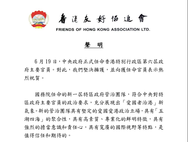6月19日,中央政府正式任命香港特別行政區第六屆政府主要官員。對此,香港友好協進會今日(20日)發布聲明表示,堅決擁護,並向獲任命官員表示熱烈祝賀。