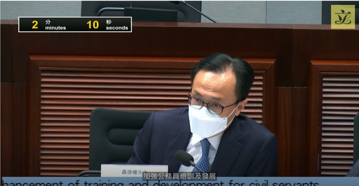 聶德權說,原則上首長級公務員需要定期接受國家事務研習課程,現時約有75%首長級公務員接受過相關課程,因疫情影響課程暫停,但目標是達致所有首長級公務員均參加。聶德權表示視乎內地或海外培訓的時間以及課程成本,或許會要求公務員承諾回港後繼續工作2至5年不等。他補充道,疫情關係促成了公務員學院的線上發展。