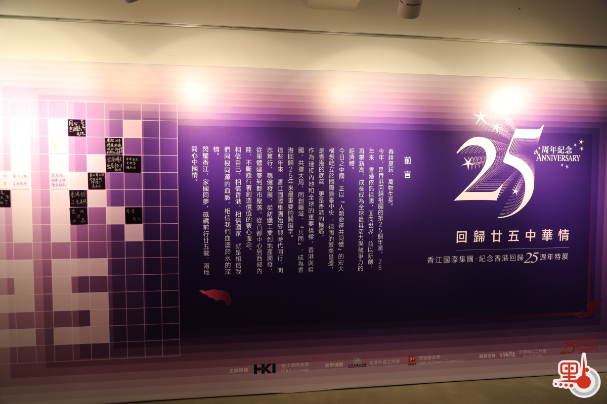 由香江國際集團主辦、全港各區工商聯及致遠基金會協辦的「紀念香港回歸25周年特展」於6月20日至7月15日在香江國際大廈2樓舉辦。展覽以時間軸的形式展示香港回歸至今的各項大事記,包括回歸祖國、抗擊非典、開放自由行、承辦奧運馬術比賽、大灣區政策出台、新選舉制度落實等,亦展示奧運門票、港樂磁帶、迪士尼公仔等具有時代色彩的物品。