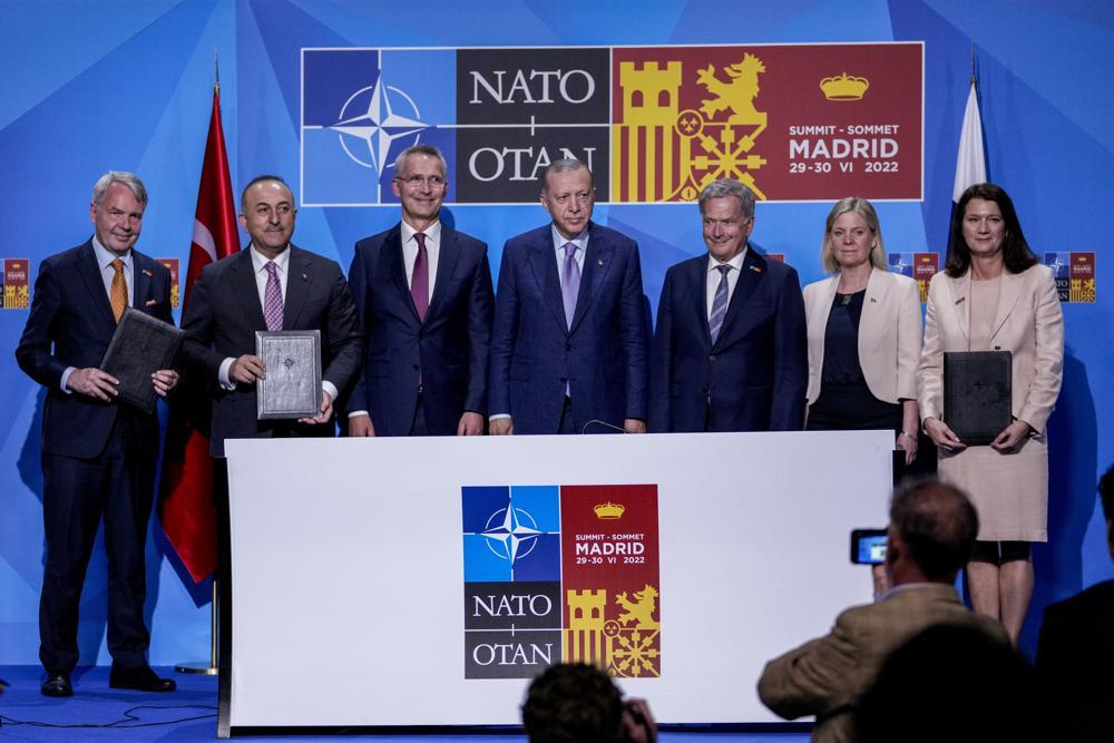 隨後,在瑞典首相安德松、芬蘭總統尼尼斯托、土耳其總統埃爾多安,以及北約秘書長斯托爾滕貝格共同出席的新聞發布會上,瑞典外長林德、芬蘭外長哈維斯托和土耳其外長恰武什奧盧分別代表本國政府在協議上簽字。