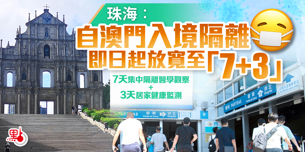 澳門新冠疫情持續,今波疫情累計發現484宗個案。珠海早前收緊自澳門入境人員的防疫措施,由原本「7天居家隔離+7天居家健康監測」升級至「7天集中隔離+7天居家健康監測」,並要求集中隔離期間費用自理。其後,國務院應對新冠肺炎疫情聯防聯控機制發布《新型冠狀病毒肺炎防控方案(第九版)》,將入境人員隔離管控時間從「14+7」調整為「7+3」。