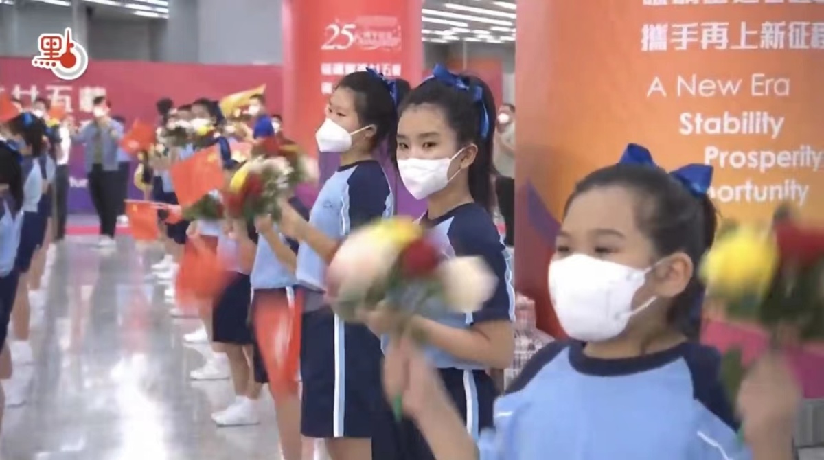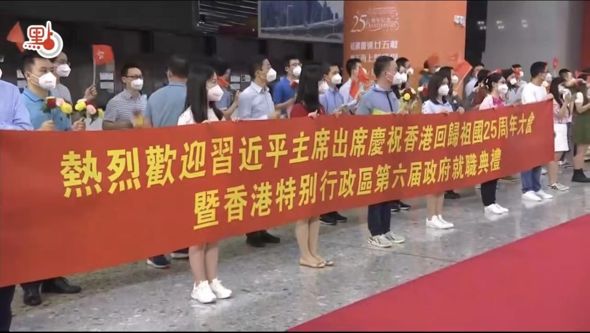 在西九高鐵站月台和大堂迎接的幾百名香港社會各界人士不斷揮動手上的國旗、區旗和小花束,高呼「熱烈歡迎」,表達香港同胞對主席視察香港的激動之情;約40多名小學生亦身穿藍色運動服夾道歡迎,場面熱鬧。