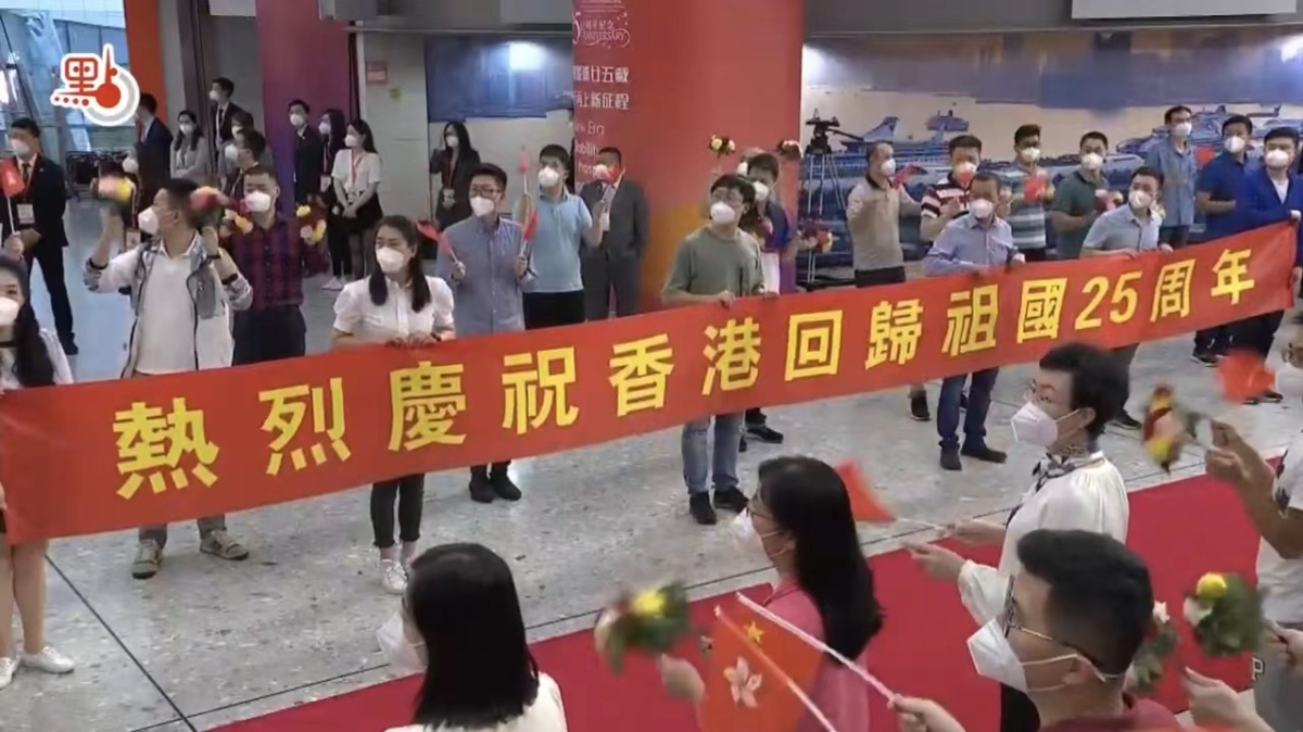 15時10分許,習近平主席乘坐的專列徐徐駛入高鐵香港西九龍站。習近平和夫人彭麗媛步出車廂,香港特別行政區行政長官林鄭月娥和丈夫林兆波上前迎接。歡迎儀式上,香港警察樂隊奏響熱情的歡迎曲,充滿精氣神的舞獅歡騰跳躍,數百名香港青少年和各界群眾代表揮動國旗、特別行政區區旗和鮮花,表達熱烈的歡迎。習近平和彭麗媛向歡迎的人群揮手致意。