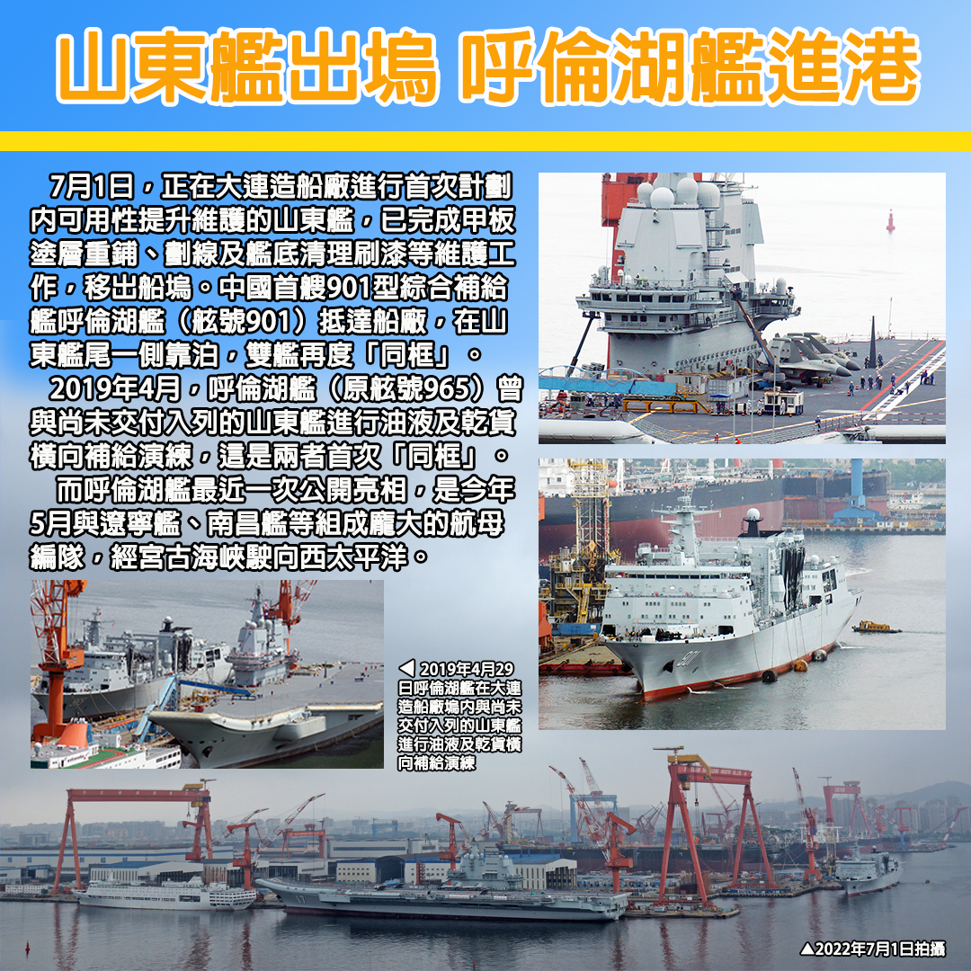7月1日,正在大連造船廠進行首次計劃內可用性提升維護的山東艦,已完成甲板塗層重鋪、劃線及艦底清理刷漆等維護工作,移出船塢。中國首艘901型綜合補給艦呼倫湖艦(舷號901)抵達船廠,在山東艦尾一側靠泊,雙艦再度「同框」。
