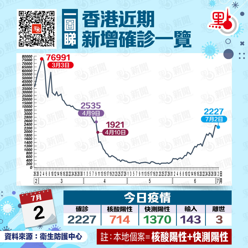 因八號熱帶氣旋警告信號在日間大部分時間維持,衞生署衞生防護中心今日(2日)改為以新聞稿匯報新冠病毒病的疫情。衞生防護中心表示,截至今日零時,本港新增2227宗確診個案,包括2084宗本地確診個案及143宗輸入個案。本地確診個案當中,714宗為核酸檢測確診,1370宗為快測陽性且核酸覆核陽性個案。本港新增確診個案連續4日超過2000宗。