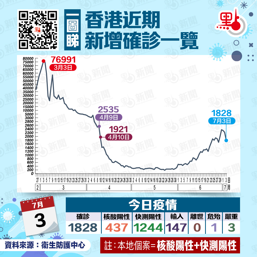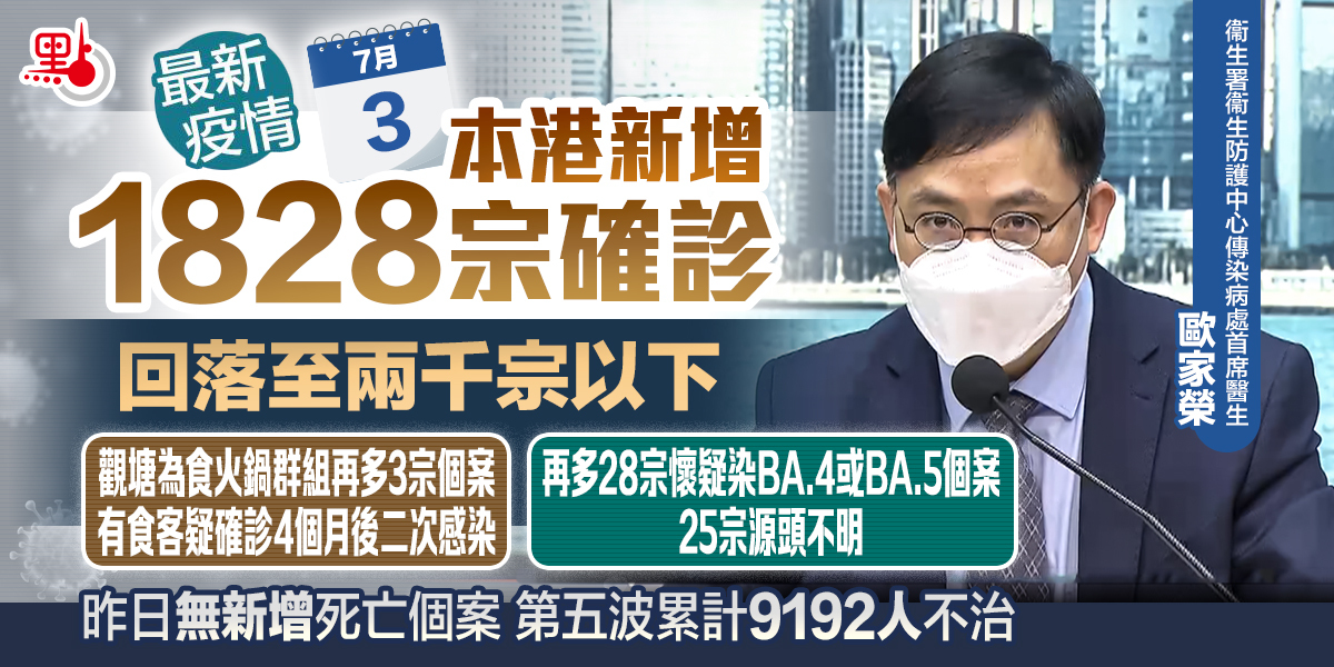 本港連續四日確診數字突破兩千宗後,稍顯回落。衞生署及醫管局今日(3日)下午舉行疫情記者會,衞生署衞生防護中心傳染病處首席醫生歐家榮公布,截至今日零時,本港新增1828宗確診個案,包括1681宗本地確診個案及147宗輸入個案。本地確診個案當中,437宗為核酸檢測確診,1244宗為快測陽性且核酸覆核陽性個案。