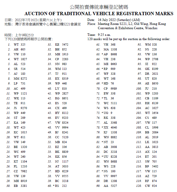 運輸署今日(4日)宣布,傳統車輛登記號碼拍賣會於7月16日(星期六)在灣仔香港會議展覽中心舊翼L2樓S221會議室舉行。發言人表示,當日將會公開拍賣280個車輛登記號碼。已繳交一千元按金作預留登記號碼以待拍賣的申請人仍須出席拍賣會並須參與競投(包括競投第一口價,其底價為一千元),否則,所預留的登記號碼可能會以底價售予另一競投人士。