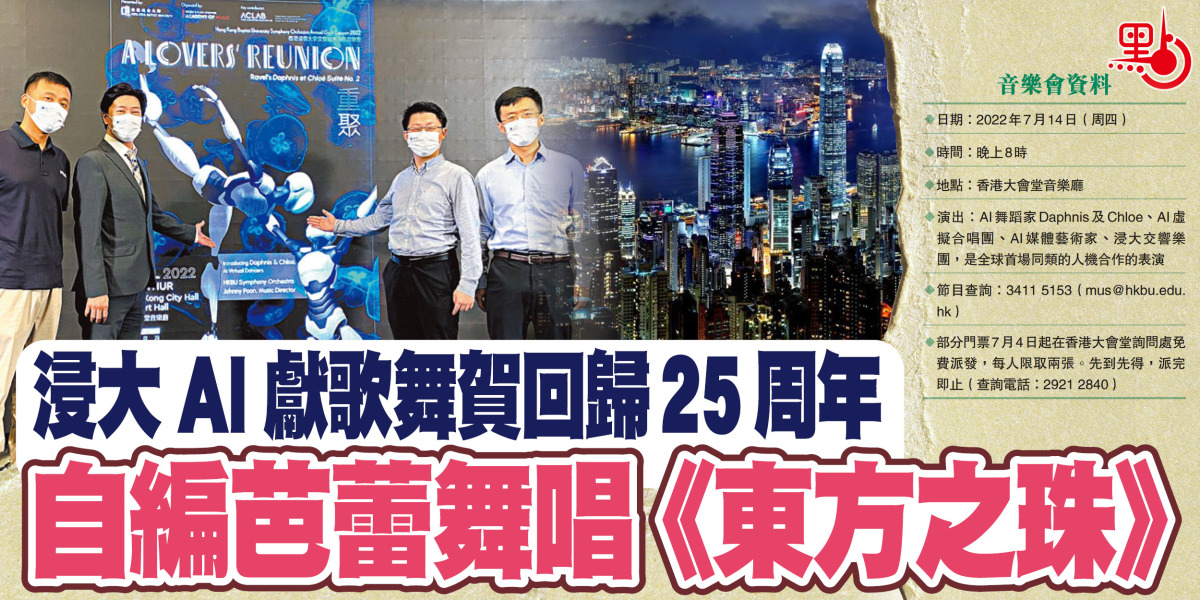 藝術與科技融合,有助發掘無限可能性。浸會大學下周四(14日)晚舉行周年音樂會,將結合該校最新AI 藝術科技研究成果,以「重聚」為主題慶祝香港回歸25周年。負責項目及指揮的浸大協理副校長(跨學科研究)潘明倫指,音樂會包括由AI 舞蹈家Daphnis 及Chloe 表演、由浸大收集動作數據後自行編排的芭蕾舞,及由逾300個聲音組成的AI人虛擬合唱團唱出《東方之珠》,與浸大真人交響樂團互動演出,是全球首場同類的人機合作表演,為觀眾帶來嶄新跨界交響樂體驗。