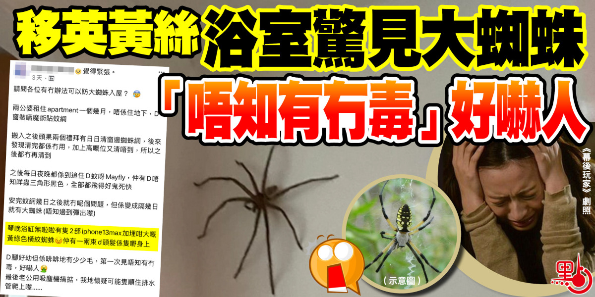 該名移英人妻喺fb專頁「在英國香港人生活交流區」發文求救,問「有冇辦法可以防大蜘蛛入屋」,帖文提到兩公婆租住apartment個幾月,首兩星期都有日日清窗邊蜘蛛網,後來發現清完都係冇用,加上屋內不時有蚊、不知名嘅黑色蟲飛入屋,所以就喺窗邊裝晒蚊網。以為可以一勞永逸?點知,有日夜晚浴缸無啦啦有隻兩部手機拼理咁大嘅黃綠色橫紋蜘蛛,形容「仲有一兩束啲頭髮喺隻嘢身上,啲腳好幼但係啡啡地有少少毛」,懷疑係順住排水管爬上樓。真係聽到都毛管戙,如果自問驚蛇蟲鼠蟻嘅人,移英前真係要諗清楚喇。