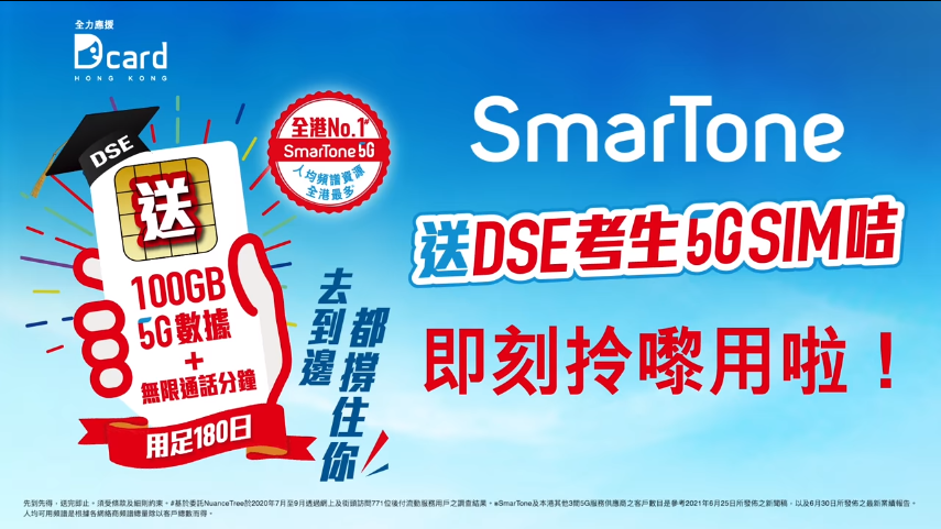 數碼通指,即日起,應屆DSE或國際文憑課程(IB)考生去任何一間SmarTone門市或流動銷售點出示DSE准考證或IB的個人識別碼(PIN)憑證,就可以拎到免費SmarTone 5G SIM咭一張。