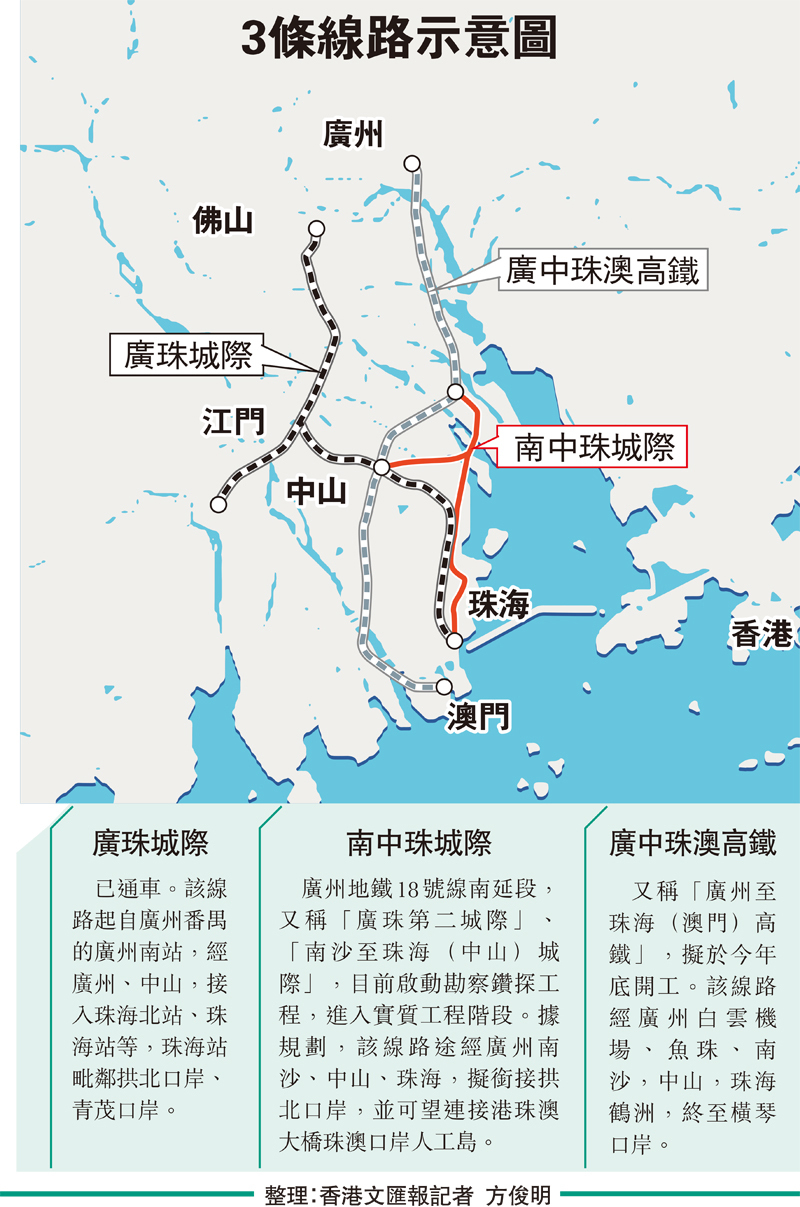 澳門特區政府今年公布的《澳門陸路整體交通運輸規劃(2021-2030)》亦特別提到,積極配合推進南沙至珠海(中山)城際鐵路等項目規劃建設。廣東省交通專家指出,澳門方面提出積極配合「南中珠城際」項目推進,預計該項目加速規劃直連港珠澳大橋珠澳口岸人工島,珠江西岸城市群的跨江交通網便利度將進一步提升,從廣州南沙坐軌道有望直達港珠澳大橋口岸,從而連接港澳地區。