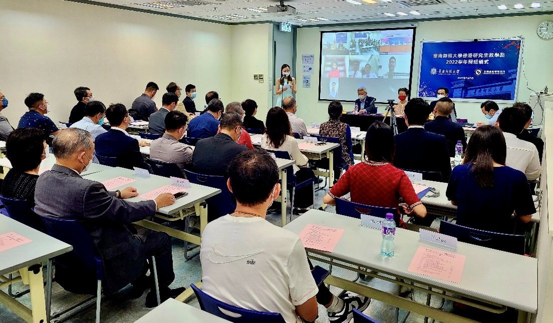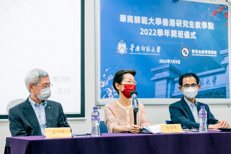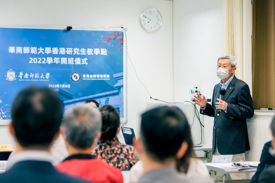 華南師範大學香港研究生教學點昨日(8日)於香港金融管理學院上環校址隆重舉行線上和線下開學典禮。香港金融管理學院董事長王中英代表學院感謝出席的各界嘉賓並表示,2022年香港金融管理學院同樣遇到了前所未有的衝擊,但我們不忘初心,牢記使命,堅持辦好研究生教育。華南師範大學王恩科校長致辭時對今年獲錄取的15位博士新生表示熱烈的祝賀,並希望同學們充分發揮內地和香港合作辦學的獨特優勢,勤學惜時,勇於擔當,矢志奮鬥,爭做棟樑。