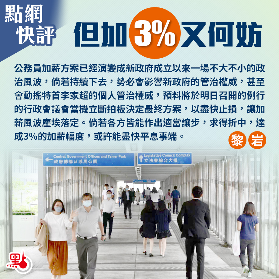 新政府今次加薪幅度決定雖然有十足客觀的理由,但確屬不智。新政府剛剛上任,本應該極力安撫好手下具體辦事人員,籠絡人心,充分調動他們的積極性,讓整個管治架構積極主動有為,但卻推出這樣一個不討好的加薪方案。加薪本是皆大歡喜的好事,卻令到自己十分被動。提高加幅或會被人質疑其易受外界左右;拒絕公務員團體聲音,又會被質疑固執己見,打擊管治士氣。無論加與不加,都會直接影響新政府的管治威信。上屆政府自施政末期尚能大幅推出萬元消費券,涉款更多達數百億,政府今次加薪只涉及恆常款項60億,若然提高至3%,也只是額外多支出不超過5億元而已,對政府財政結構並無實質性影響。