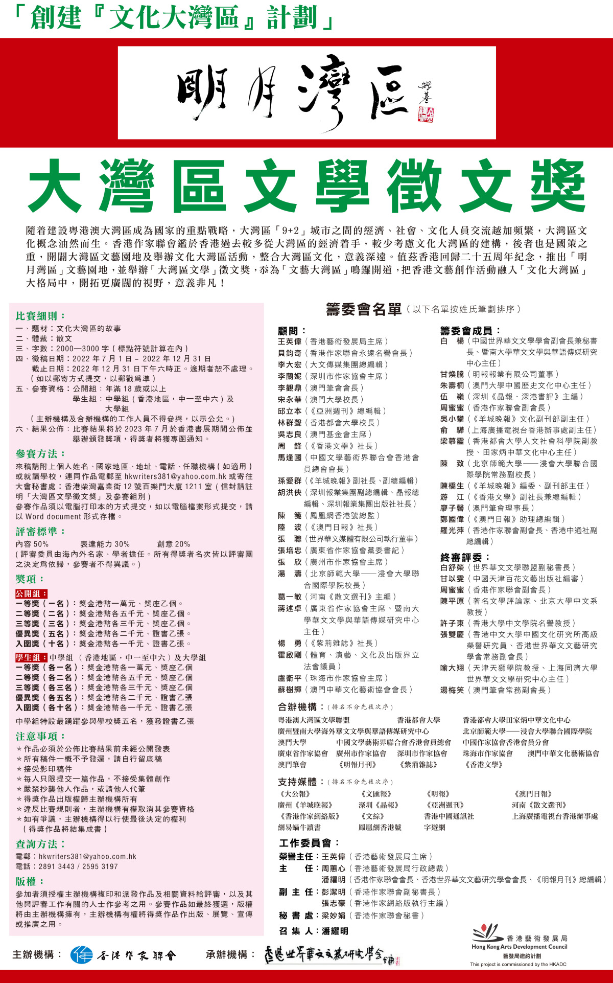 由香港作家聯會主辦,香港世界華文文藝研究學會承辦,香港藝術發展局邀約計劃的「大灣區文學徵文獎」即日起接受投稿,截稿日期為今年12月31日。