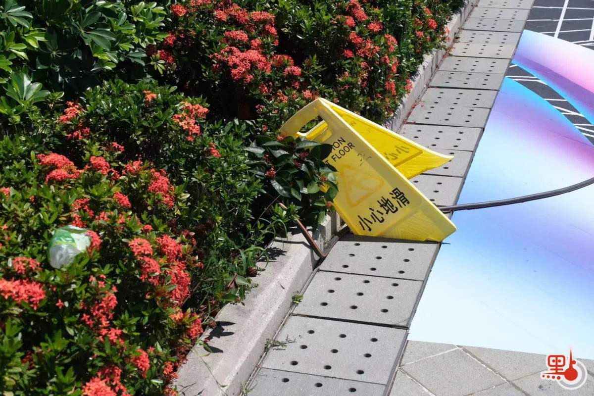 「小心地滑」路牌跌進坑渠。(點新聞記者麥鈞傑攝)