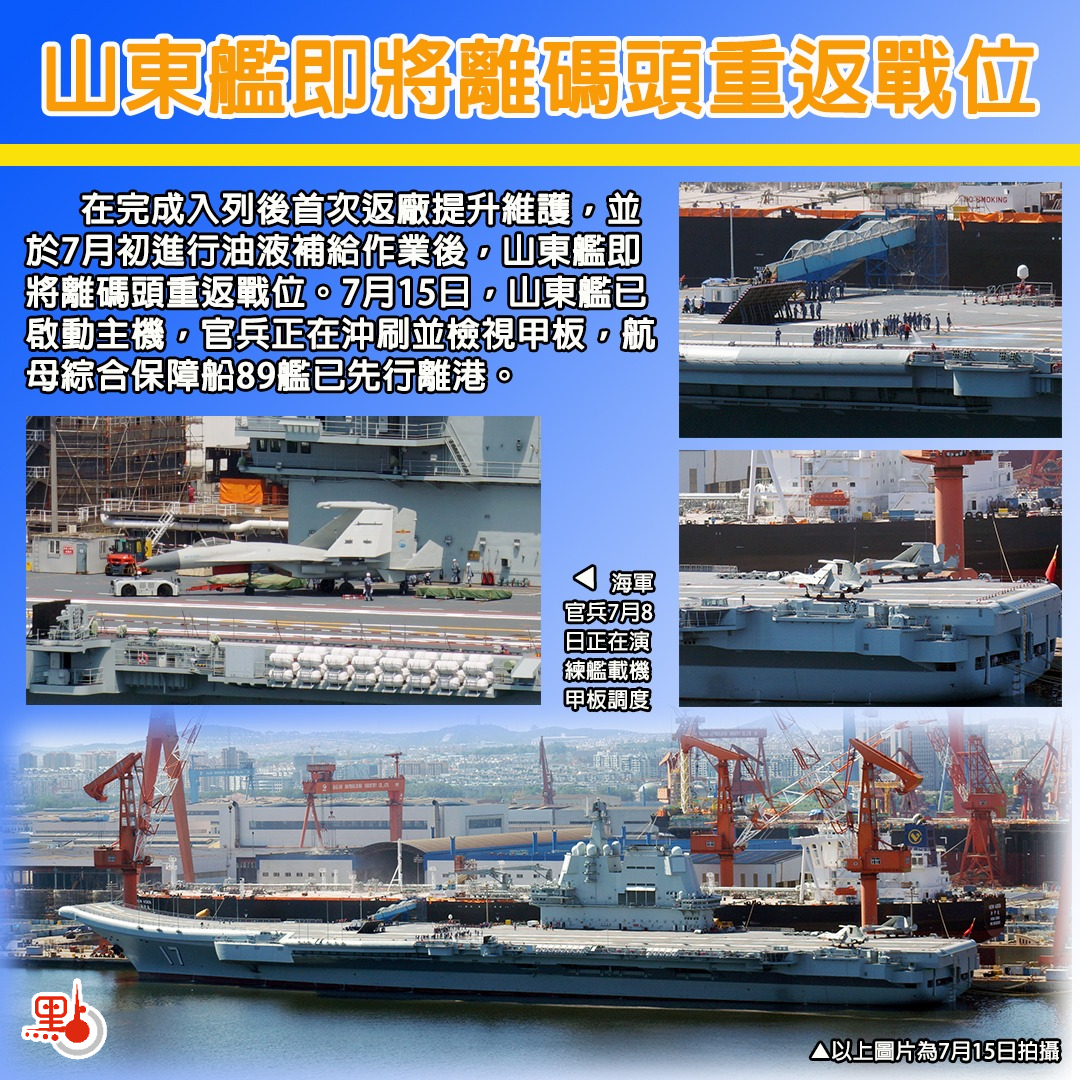 在完成入列後首次返廠提升維護,並於7月初進行油液補給作業後,山東艦即將離開碼頭重返戰位。今日(7月15日),山東艦已啟動主機,官兵正在沖刷並檢視甲板,航母綜合保障船89艦已先行離開港口。