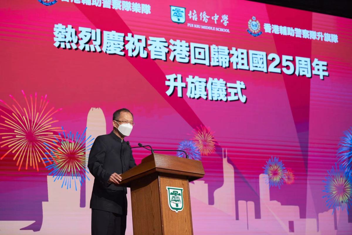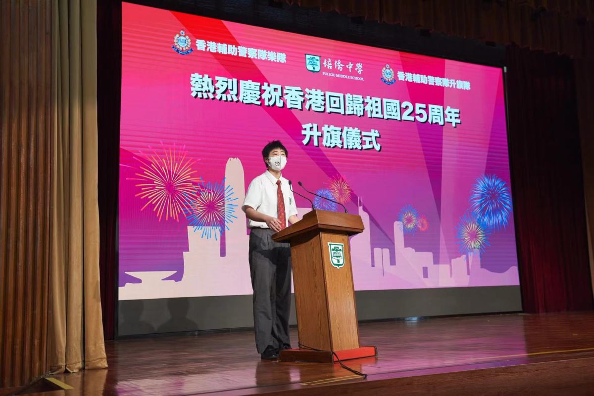 首先,培僑中學中五級周沃霖同學進行國旗下的講話。他指出1997年香港歷經百年滄桑後回到祖國懷抱,25年來有過無數璀璨的瞬間,也經歷了不同意識形態的風雨洗禮,在祖國庇護下,香港這顆明珠始終熠熠生輝。值此回歸25周年之際,香港迎來了由亂到治並踏入由治及興的新發展局面,他相信新一屆政府必將以民為本,維護香港市民的切身利益,同時融入國家發展大局,牢牢抓住國家發展機遇,成為大灣區城市鏈經濟開發中的領頭羊,再鑄香港「東方之珠」新榮光。他提到習主席在回歸25周年大會上有關青年的講話,對身為香港青年深感責任重大,他相信未來掌握在青年人的手中,只有努力學習,用知識裝備自己,緊跟上國家發展的步伐,才能擔當起香港未來發展建設的歷史使命。