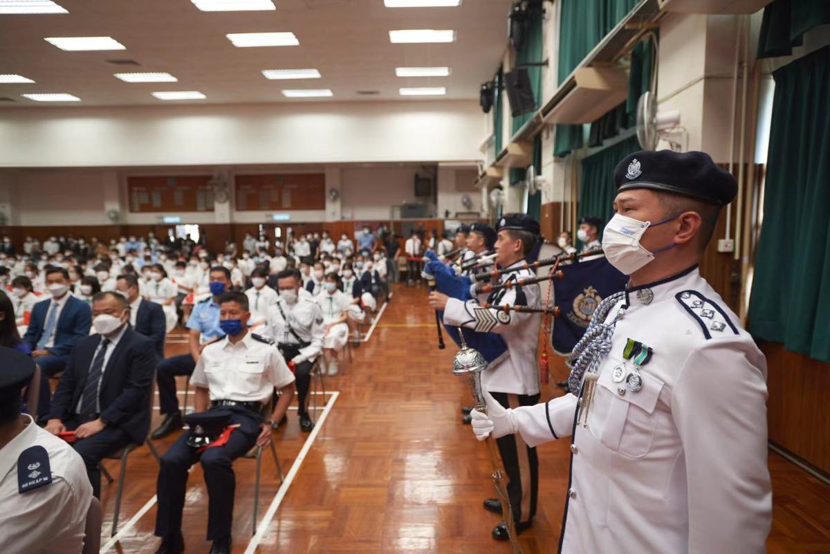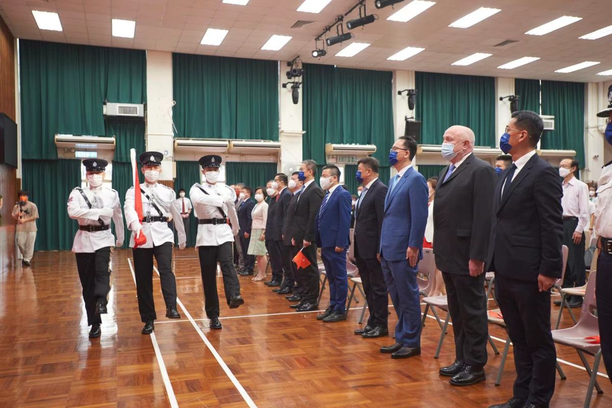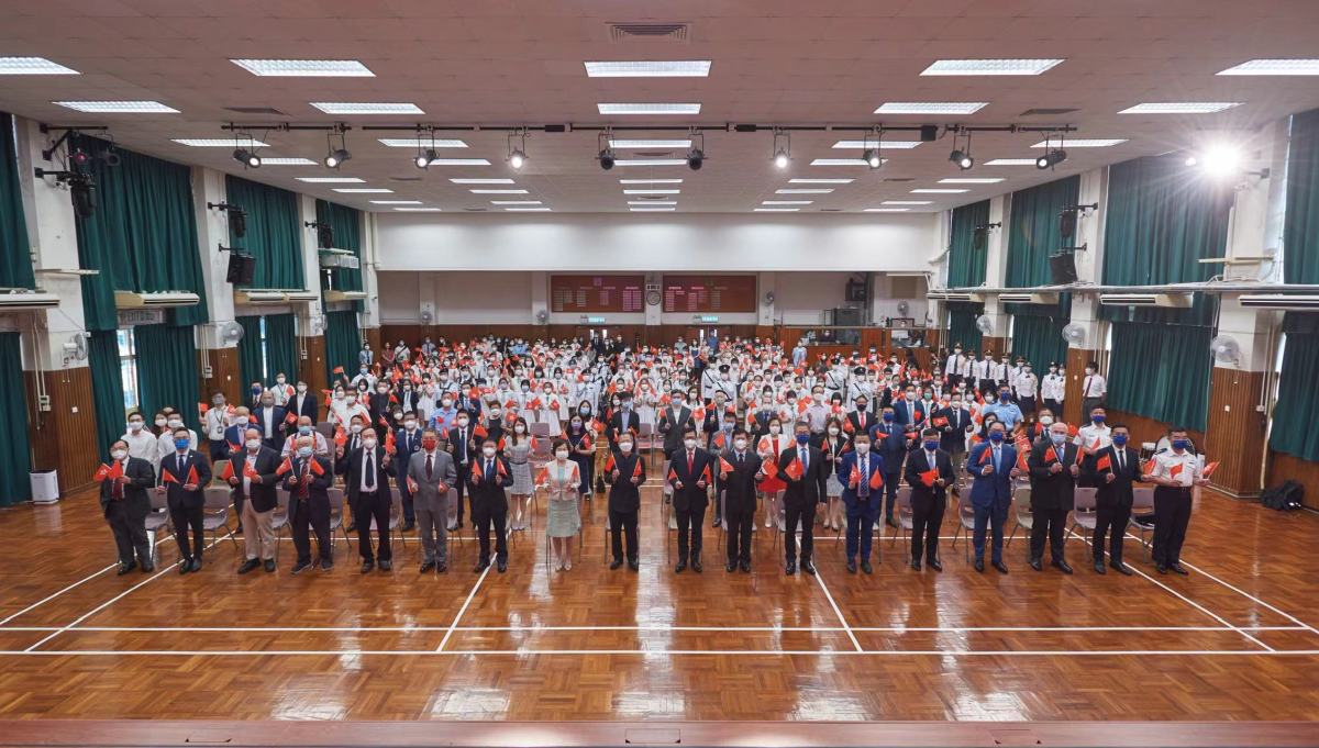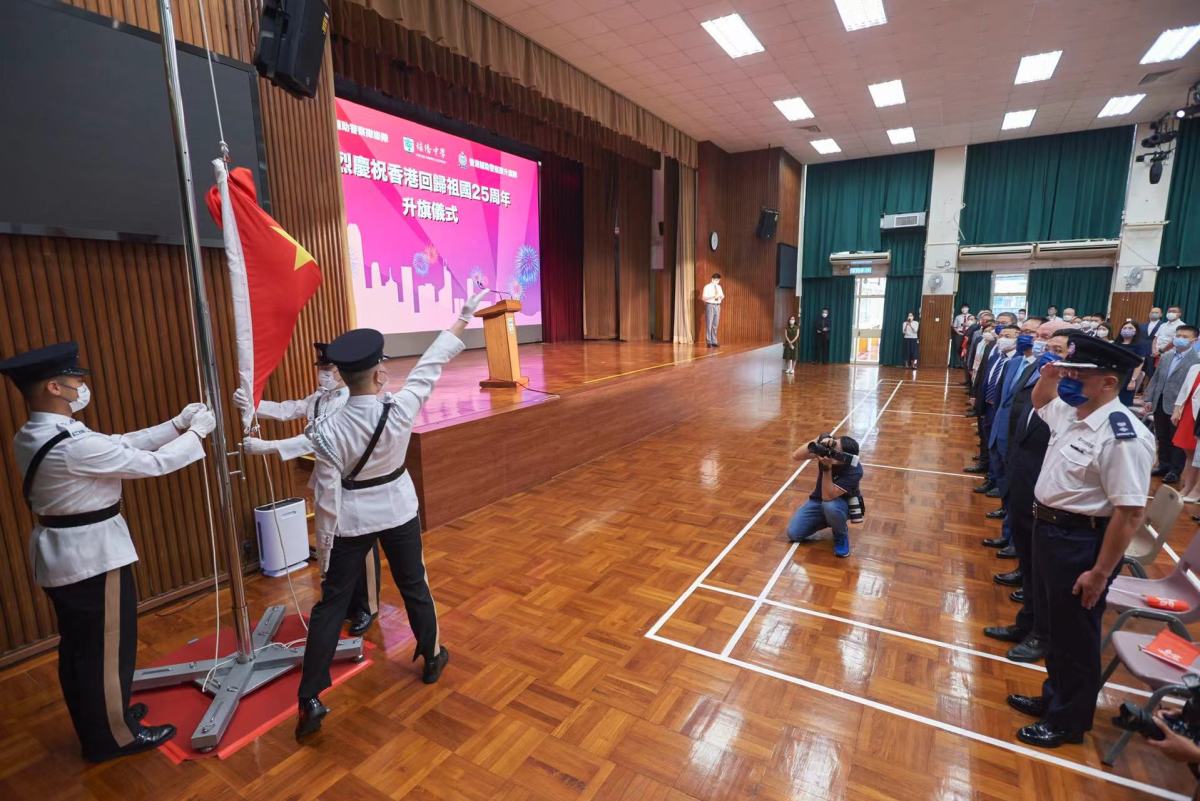 香港輔助警察隊樂隊奏起悠揚樂曲《歌唱祖國》,拉開了典禮的序幕,整齊劃一的香港輔助警察隊升旗隊操着中式部操邁向旗杆,五星紅旗在莊嚴的國歌聲中冉冉升起,隨風飄揚。這是香港歷史上香港輔助警察隊升旗隊第一次進入校園升起國旗。