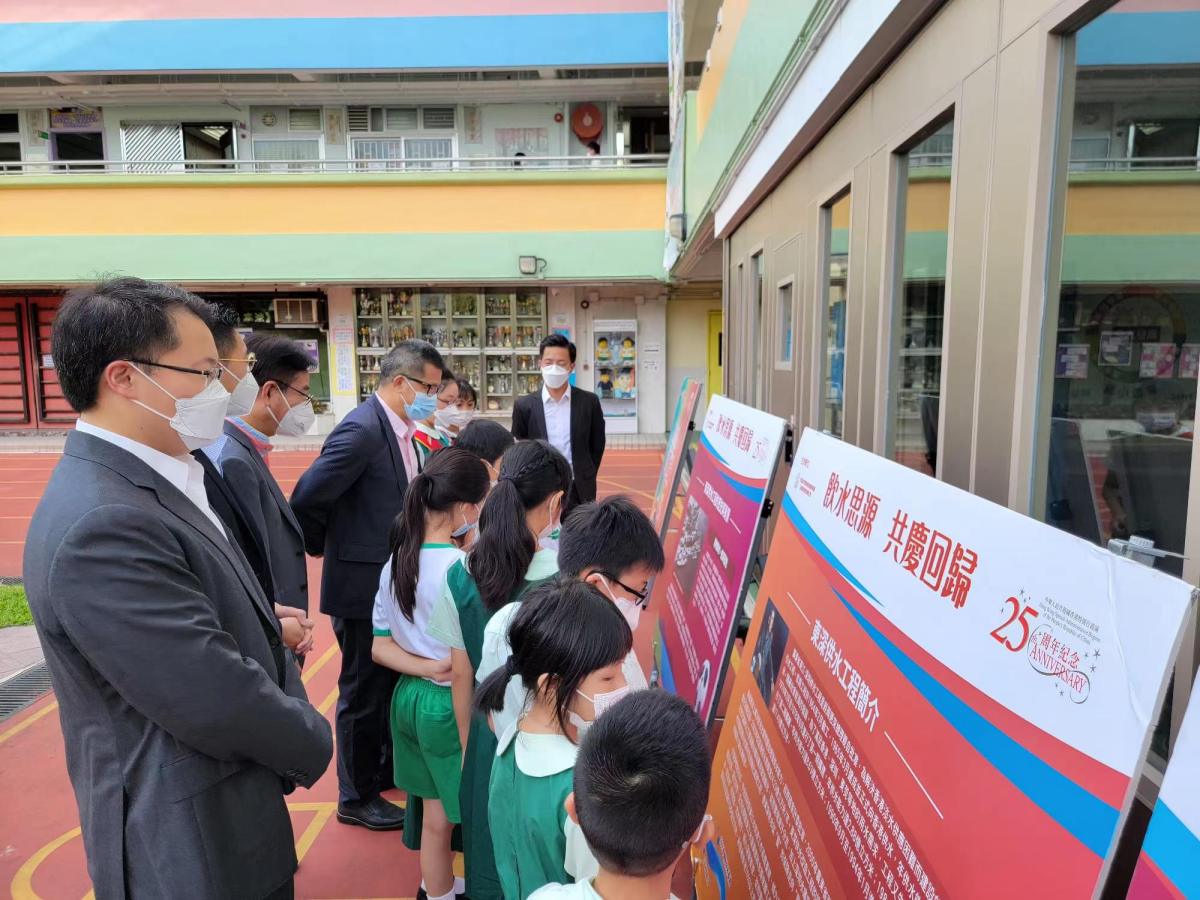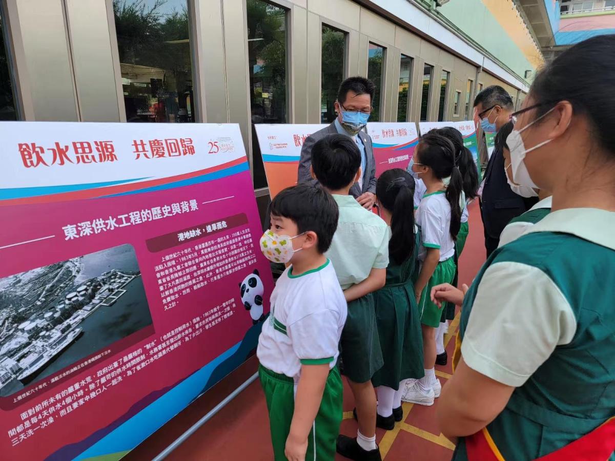 新社聯北區地委會主席溫和輝及副主席潘孝汶,今日(18日)聯同北區家長教師會聯會主席侯漢碩、北區青年協會主席廖宇軒及上水鄉原居民村代表廖興洪,到鳳溪第一小學現場參觀展板講解教學。鳳溪第一小學校長朱偉林及教師們在校園操場外,向學生細心講解東深供水工程的歷史背景、初期建設與擴建改造等一系列發展概況,讓他們深刻認識到半個多世紀前在香港遭遇大旱,供水緊缺的危難時刻,是祖國人民排除萬難,不辭艱辛地支援香港同胞。