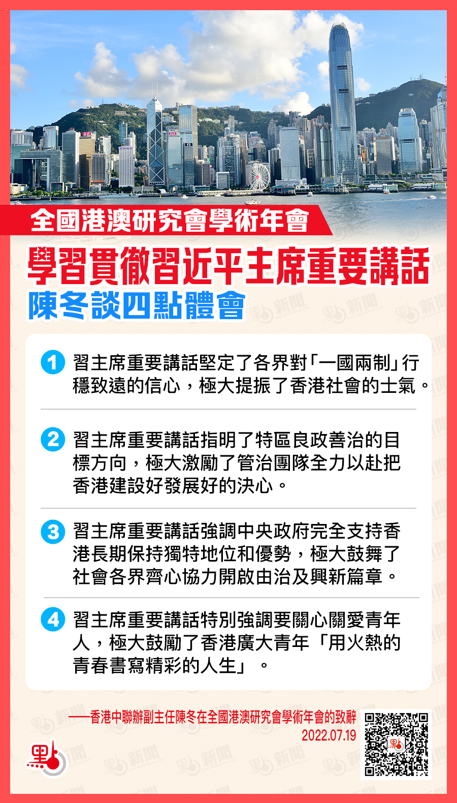 陳冬表示,習近平主席重要講話,在香港和海內外引起了熱烈反響。習近平主席重要講話堅定了各界對「一國兩制」行穩致遠的信心,極大提振了香港社會的士氣。習近平主席強調,「一國兩制」是經過實踐反覆檢驗了的,符合國家、民族根本利益,符合香港、澳門根本利益,得到十四億多祖國人民鼎力支持,得到香港、澳門居民一致擁護,也得到國際社會普遍贊同。這樣的好制度,沒有任何理由改變,必須長期堅持!習近平主席這一鄭重宣示,彰顯了中央堅持「一國兩制」方針的堅強意志和堅定決心,消除了社會疑慮,為香港和國際社會派下「定心丸」。香港各政團、機構、商會、社會知名人士等紛紛表示,在「一國兩制」方針的堅實保障下,香港一定能夠創造更大輝煌。