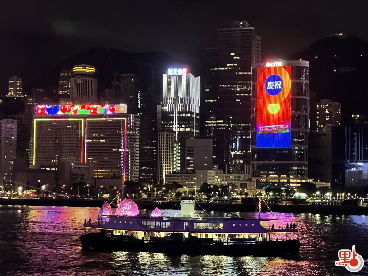特別版「幻彩詠香江」上演,往返尖沙咀至中環或灣仔的天星小輪,船身亦會加上色彩繽紛的燈帶,在匯演時隨音樂轉換躍動。(點新聞記者李九歌攝)