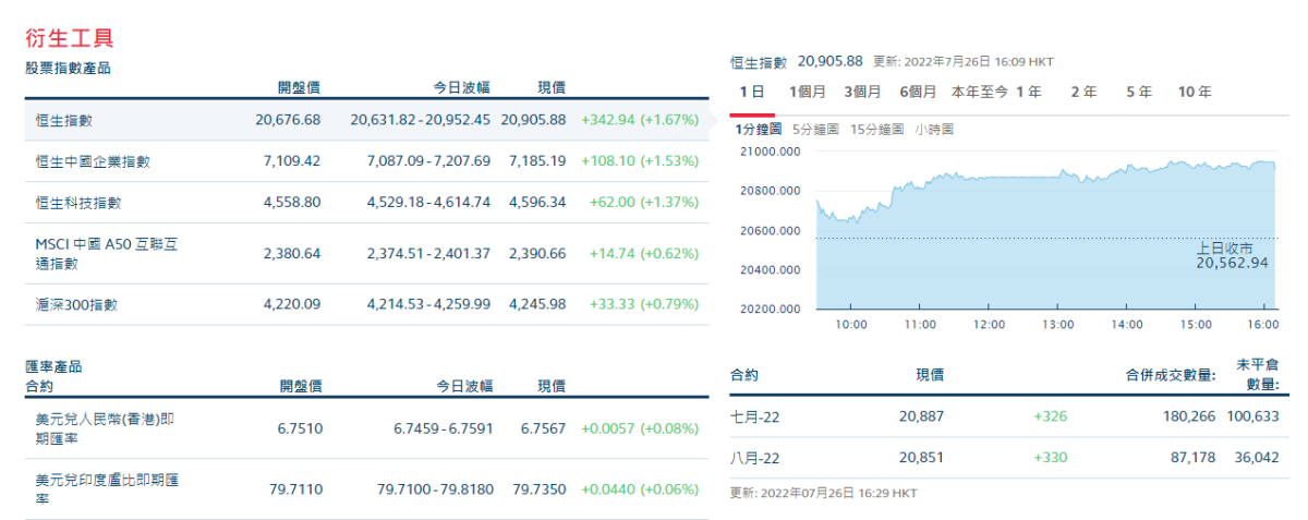 香港股市今日(26日)回暖,三大指數午後漲幅擴大,恒生指數收漲1.67%,報20905點,恒生科指收漲1.37%,報4596點,國企指數收漲1.53%,報7185點。截止收盤,港股今日上漲1094隻,下跌748隻,收平1051隻。